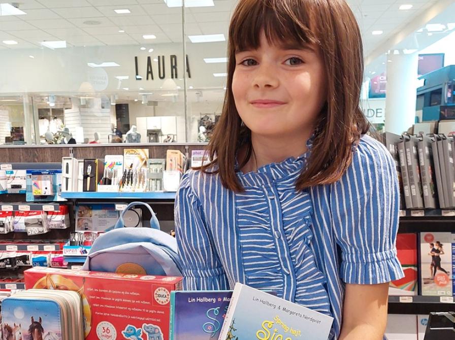 Livia valgte både en ny rygsæk, penalhus og et spil Vildkatten. Hun snuppede også to bøger fra serien om hesten Sigge.