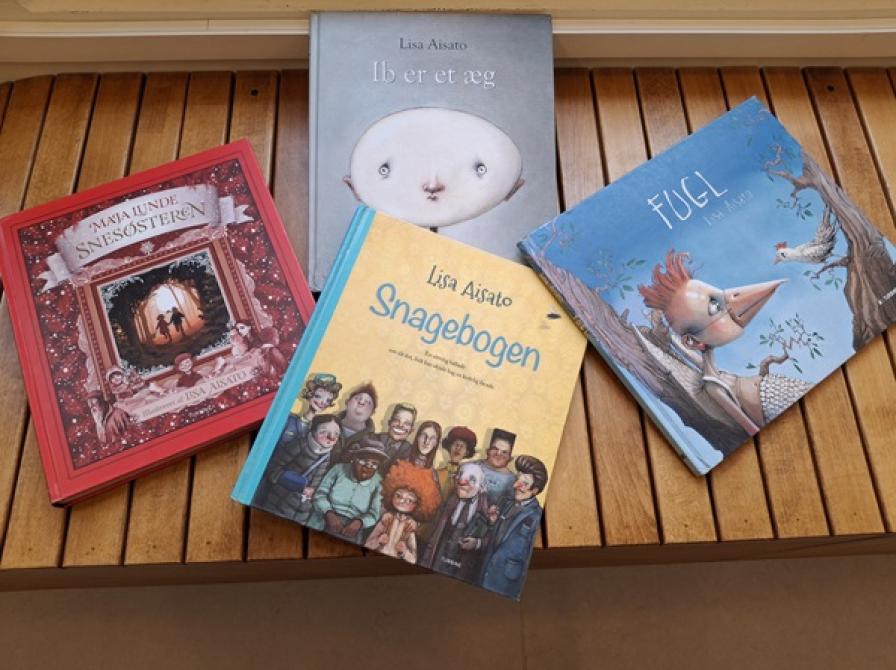 Mine to oldemødre, Fugl, Ib er et æg, Snagebogen, En fisk til Luna er alle billedbøger, som Lisa Aisato både har forfattet og illustreret. Igen trækkes du ind i fortællingen af de kunstneriske illustrationer.