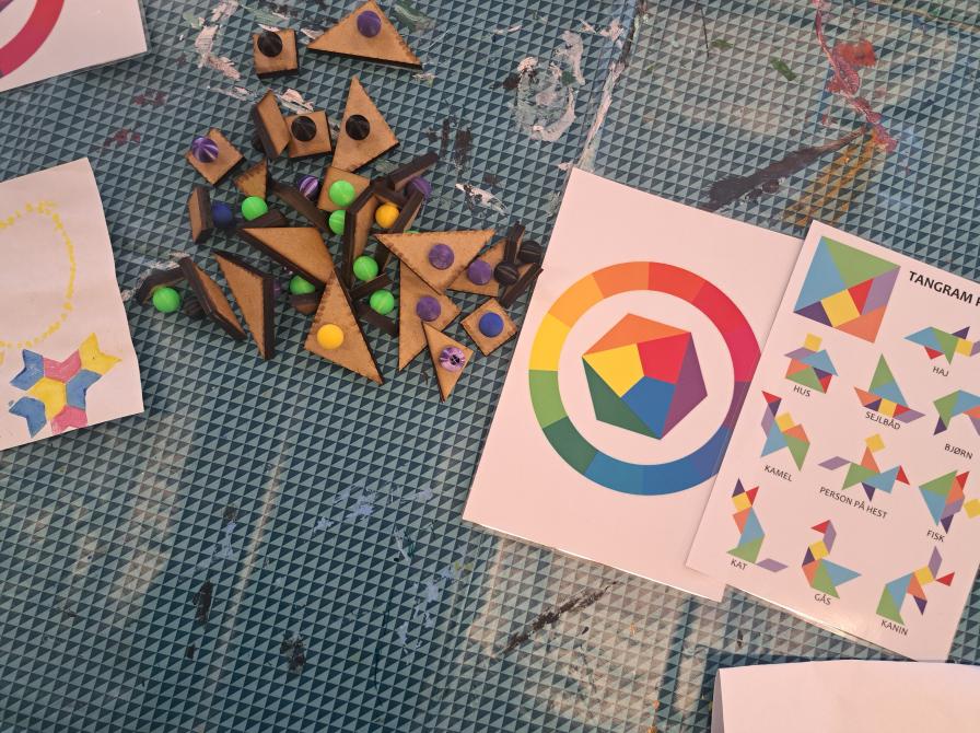 Af forskellige trykteknikker kunne familierne afprøve kræfter med tangram-tryk, som er et slags geometrisk puslespil, hvor man med forskellige polygoner kunne bygge sjove og farverige (påske)dyr.