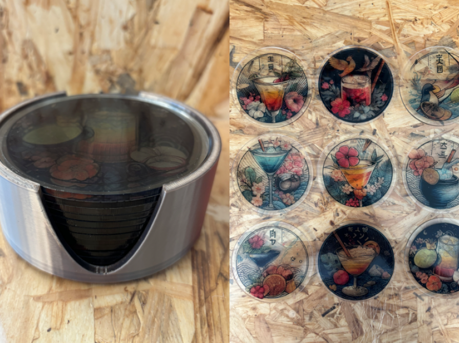 Til ølbrikkerne var drømmen at give et mere holdbart take på den classiske pap pubcoaster. Derfor var mdf det åbenlyse valg af materiale, da det har samme fornemmelse som hårdt pap. Til at dekorere har vi printet vores genererede billeder på vores vinylskærer og herefter monteret dem på ølbrikkerne. Et materiale vi forventer er let at tørre af, så de kan holdes rene.
